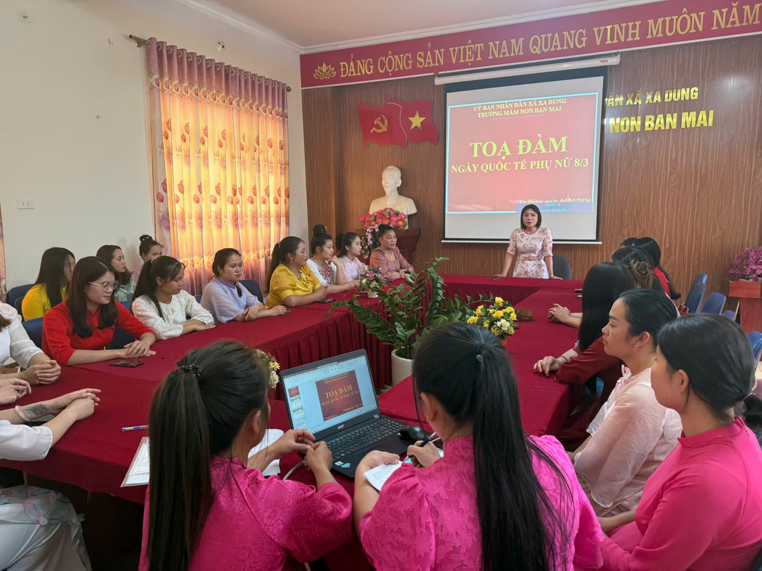 Mỗi dịp tháng ba lại ùa về, toàn thể trường mầm non Ban Mai chúng em lại tưng bừng chuẩn bị công tác chào mừng kỷ niệm ngày Quốc tế phụ nữ 8-3 và ngày thành lập Đoàn TNCS Hồ Chí MinMinh 26/3. Hôm nay là ngày quốc tế phụ nữ, trong không khí vui tươi, phấn khởi của ngày tọa đàm nhân kỷ niệm, tôi xin thay mặt cho Chi bộ Đảng, nhà trường, gửi tới BGH cùng toàn thể các đồng nghiệp... lời chào và lời chúc tốt đẹp nhất.